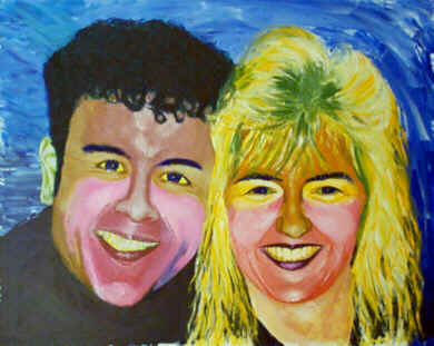 | Andy and Corinne H36in W48in (H 91cm W122cm) Dated 1-5-95 Price £360 $50 Acrylic on hardboard From a photo by Doug Lowe. I wanted to show the couple's affection for one another and also their happiness. they had not long been married and the deep trauma of Andy's tumour in his back had not yet begun. I should have shown Andy with his glasses on as he is inseparable from them.. I wanted to show his boyish vulnerability. Glasses would have hidden it, so I took them off in the painting. |