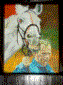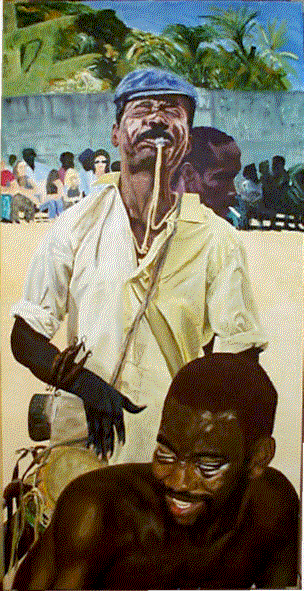 Wrestling Match H72in W36in (H183cm W91cm) Dated 15-3-96 Price £3,000 $4200 Acrylic on MDF with integral frame From Photos by Doug Lowe taken in the Gambia and New York. This project brought home to me the need to use Computer Graphics. The Gambian drummers were taken at a wrestling match, a very exciting, noisy and seriously entertaining event, with much whistle blowing and drum beating. But I needed a large subject in the foreground. I had fortuitously taken a photo earlier in New York of a pavement musician, using empty paint buckets and other discarded items as his percussion instruments. For a small payment he let me photograph him. What struck me about the New Yorker was how closely he matched the Gambians physically. His ancestors must have come from that part of the world! |