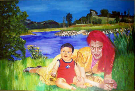 most gentle and approachable. I had to put a twist in it so made Sean darker skinned than in reality. I felt that it reflected better her personality. I have to admit that this is not one of my favourite paintings. The landscape does nothing for me although the photo was taken in this setting. I suppose, I want more than face value meaning from a painting and this painting offers nothing but bland reality. Boring! I should have painted them sitting in a flower or better underneath an erupting volcano then there would have been some real meaning to get into, but at the time I had not got into computer graphics to inject some more chemistry. Perhaps I will have another go at it but in semi- abstract style. |